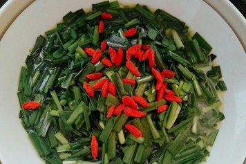 韭菜补肾起阳、温阳行气,枸杞滋养补虚、补肾益精。韭菜、枸杞子煮水,具有温阳补肾的功效,可用于肾虚阳痿、腰膝酸软、遗精遗尿等情况。