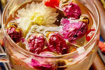 菊花味苦性微寒,有清热解毒之效,金银花甘寒,清热解毒,消散痈肿力强,故菊花、玫瑰花、金银花一起泡具有清热解毒的功效,可用于改善各种热毒壅盛所致的外疡内痈、喉痹、丹毒、疮痈初起、红肿热痛等症状。