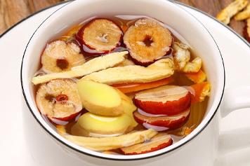 陈皮味苦、辛,性温,归肺、脾经,加上生姜、红枣均归脾经,三者合用可益气利肺、理气健脾,生姜陈皮红枣泡水喝具有补脾益气的功效,可用于脾胃不调、胸腹胀满、脾胃虚弱等症。
