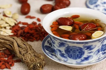 黄芪味甘、性微温,归脾、肺经;党参味甘、性平,归脾、肺经;红枣味甘、性温,归脾、胃、心经;枸杞子味甘,性平,归肝、肾经,而用黄芪党参红枣枸杞子泡水喝具有补中益气、养血生津、利水消肿的功效。