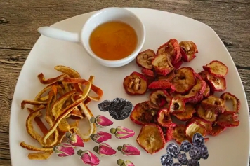 玫瑰为蔷薇科植物玫瑰的干燥花蕾,山楂为蔷薇科植物山里红或山楂的干燥成熟果肉,陈皮为芸香科植物橘及其栽培变种的干燥成熟果皮,乌梅为蔷薇科植物梅的干燥成熟果实。玫瑰山楂陈皮乌梅茶具有行气、健胃安蛔的功效。