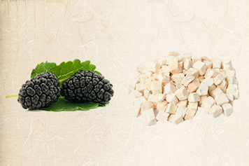 桑葚为桑科植物桑的干燥果穗,味甘、酸,性寒,归心、肝、肾经;茯苓为多孔菌科真菌茯苓的干燥菌核,味甘、淡,性平,归心、肺、脾、肾经。桑葚茯苓具有滋阴补血、生津润燥、利水渗湿等功效。
