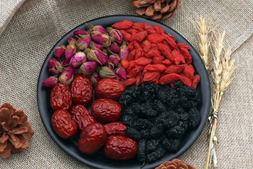 桑葚味甘、酸,性寒,入肝、肾经;枸杞味甘,性平,归肝、肾经;红枣味甘、性温,归脾、胃、心经;玫瑰花味甘、微苦,归肝、脾经。桑葚枸杞红枣玫瑰花茶具有补气养血、生津润燥的功效。