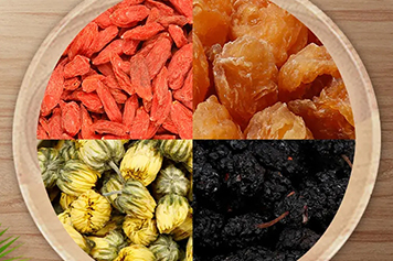桑葚味甘、酸,性寒,入肝、肾经;枸杞味甘,性平,归肝、肾经;龙眼干一般是指干龙眼肉,为龙眼的假种皮脱水制成,味甘、性温,入心、脾经;菊花味甘、苦,性微寒,归肺、肝经。桑葚枸杞龙眼干菊花茶具有补虚强壮、清热生津的功效。