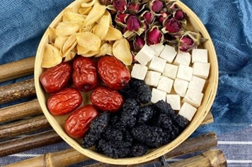 桑葚是桑的干燥果穗;玫瑰花是蔷薇科植物玫瑰的花;百合指百合的地下鳞茎;茯苓为多孔科茯苓的空壳;红枣为枣树的果实。桑葚玫瑰花百合茯苓红枣具有养血安神、补充营养的功效。