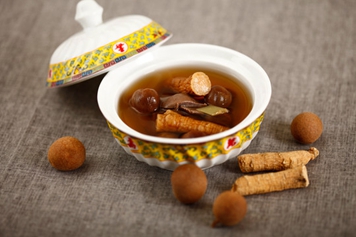 取适量桂圆、人参洗净,加入清水煮沸后倒出液体,至温度适宜后即可服用。