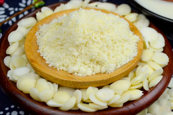南杏仁粉呈扁心脏形,长1.6~2.1cm,宽1.2~1.6cm,顶端尖,基部圆,左右对称,种脊明显,种皮较苦杏仁为厚,淡黄棕色,自合点处分散出许多深棕色脉纹,形成纵向凹纹。断面白色。子叶接合面常见空隙。气微,味微甜。以颗粒均匀而大、饱满肥厚、不发油者为佳。