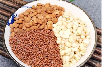 甜杏仁为蔷薇科杏属植物野杏或山杏的果实,桃仁为蔷薇科植物桃或山桃的成熟种子,莱菔子为十字花科植物莱菔的种子。甜杏仁、桃仁、莱菔子同用,具有止咳平喘、润肠通便、消食化积等功效。