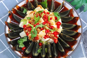 皮蛋豆腐的原料为皮蛋、豆腐,皮蛋又叫松花蛋,是鸡蛋或鸭蛋加工而成的熟食品,豆腐为豆科植物大豆种子的加工制成品。皮蛋豆腐具有补充营养、清热下火的功效。