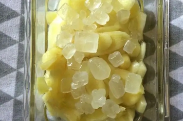 苹果为蔷薇科植物苹果的果实,是日常生活中常见的水果,其果肉脆嫩,酸甜适度。冰糖是砂糖的结晶再制品,其颜色多为白色、淡黄色,味道香甜。生姜为姜科植物姜的新鲜根茎,其气香特异,味辛,性微温,归肺、脾、胃经。白醋是由糯米经制曲、浸泡、蒸料、糖化发酵、酒精发酵等操作后加工制作而成,是一种常见的调味品。苹果冰糖生姜白醋同用具有补充营养物质、温中止呕等功效。