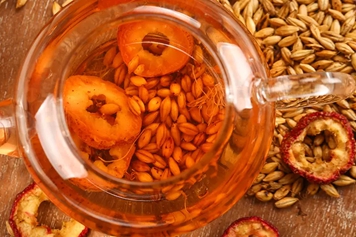山楂麦芽水即用山楂、麦芽泡水制成,山楂为蔷薇科落叶乔木或大灌木山楂及野山楂的果实,性微温味甘、酸,归脾、胃、肝经。麦芽为禾本科植物大麦的成熟果实经发芽干燥而成,性平味甘,归脾、胃经,山楂麦芽水具有消食化积、疏肝行气的功效。