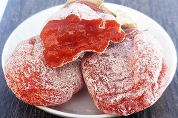 取有柿饼霜的柿饼,放入口中,直接咀嚼食用即可。