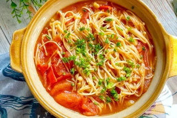 西红柿金针菇汤酸甜可口,营养丰富,具有补充营养、促进排便等功效。
