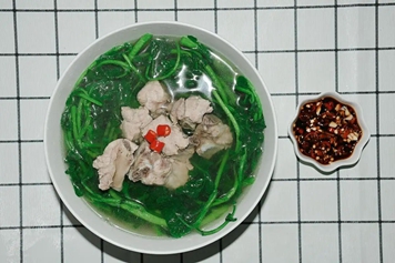 将西洋菜洗净切段,猪骨砍成小块,一起放入锅中,加水炖煮至食材烂熟,待汤汁收浓后,盛入碗中即可饮用。