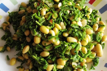 鲜香椿洗净切末,大豆浸泡后炸成金黄色,撒入香椿末拌匀后装盘,即可食用。