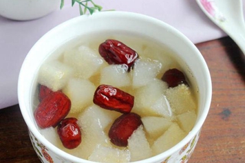 红枣又名大枣,为鼠李科植物枣的成熟果实,味甘,性温,归脾、胃、心经;梨为蔷薇科植物雪花梨的成熟果实,性凉味甘、微酸,归肺、胃经,红枣和梨一起煮具有润肺清燥、补中益气、润肠通便等功效。