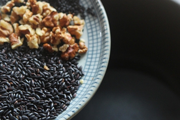黑芝麻味甘,性平,归肝、肾、大肠经;黑豆味甘,性平,归脾、肾经;黑米味甘,性平,归脾、胃经;核桃味甘,性温,归肺、肾、大肠经。黑芝麻黑豆黑米核桃在一起吃具有养肾益精、补充营养等功效。