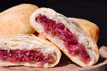 鲜花饼一般是由玫瑰酱做馅制作而成,玫瑰酱中玫瑰花为蔷薇科植物玫瑰的干燥花蕾,芳香浓郁、味微苦涩,鲜花饼味甘、微苦,性温,归肝、脾经,具有行气解郁、活血止痛、补充营养的功效。