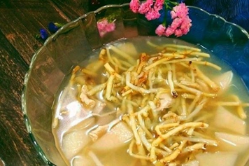 雪梨为蔷薇科植物白梨的果实,秋季果实成熟时采收,鲜用、绞汁或切片晒干备用;折耳根为三白草科植物蕺菜的全株,夏、秋季采集带根全草,晒干后使用。雪梨和折耳根煮水喝具有清热解毒、利尿通淋等功效。
