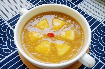 小米粥是小米加入清水后熬煮而成,小米味甘、咸,性凉,归脾、肾经;香蕉味甘,性寒,归脾、胃经。小米粥加香蕉营养丰富,具有健脾、通便、补充营养等功效。