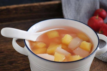 雪梨甘酸,入肺经,长于清肺化痰、生津止渴;苹果味甘,入肺经,能润肺悦心、生津开胃,具有润肺生津的功效;冰糖性平,入肺经,长于理肺化痰,具有润肺生津、止咳消痰的功效,所以雪梨苹果冰糖水具有润肺生津的功效,可用于口干咽燥、肺燥咳嗽等情况。
