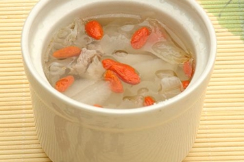 雪梨瘦肉汤含膳食纤维,食用后能促进胃肠道蠕动,加速食物通过胃肠道,吸收水分软化大便,具有促进消化的功效。