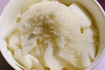 白萝卜为十字花科植物莱菔的鲜根,味辛、甘、微苦,性凉。白糖是由甘蔗和甜菜榨出的糖蜜制成的精糖,味甘,性平。白萝卜拌白糖具有滋阴润肺、补脾养胃等功效。