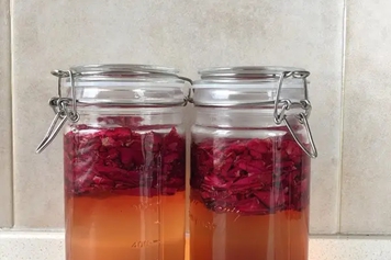 将白醋泡玫瑰花加入适量温水冲泡,搅拌均匀后即可饮用。