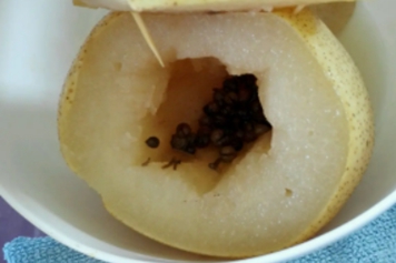 将雪梨、花椒清洗干净,加入适量冰糖、水炖煮,煮至雪梨软烂即可。