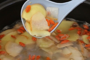 冰糖是砂糖煎炼而成的冰块状结晶,呈白色、微黄、淡灰等色;雪梨为蔷薇科植物雪花梨的成熟果实,秋季果实成熟时采收;生姜为姜科植物生姜的新鲜根茎。冰糖雪梨加生姜具有止呕、化痰止咳的功效。