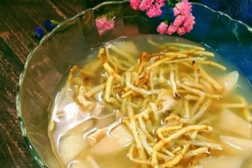 冰糖雪梨折耳根中的折耳根常可在夏季生长茂盛、花穗多时采割,除去杂质后可鲜用或干燥备用。