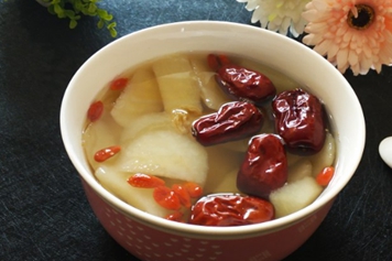 冰糖为白砂糖再加工制成的冰块状结晶,味甘,性平。红枣为鼠李科植物枣的干燥成熟果实,味甘,性温。雪梨为蔷薇科梨属植物梨的果实,味甘、微酸,性寒。冰糖红枣雪梨汤具有止咳化痰、健脾益胃等功效。