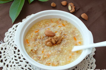 小米味甘,入脾经,能健脾和胃。故小米核桃粥具有健脾的功效,可用于脾虚所致的食少、便溏等病症。