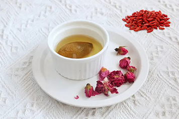 枸杞味甘,性平,归肝、肾经,可滋补肝肾。因此陈皮、枸杞、玫瑰花泡水喝具有滋补肝肾的功效,适用于肝肾亏虚所致的虚劳精亏、阳痿遗精等症。