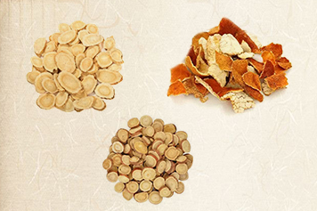 陈皮为芸香科植物橘及其栽培变种的干燥成熟果皮,其味苦、辛,性温,归脾、肺经;黄芪为豆科植物蒙古黄芪或膜荚黄芪的干燥根,味甘,性微温,归脾、肺经;甘草为豆科植物甘草、胀果甘草或光果甘草的干燥根和根茎,味甘,性平,归心、肺、脾、胃经。陈皮黄芪甘草相配,具有补脾益气、止咳化痰等功效。