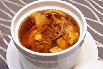 冬虫夏草炖母鸡中含有蛋白质、脂肪、维生素A、钙、磷、铁等营养物质,能帮助人体补充营养。