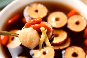 红枣枸杞桂圆生姜红糖煮水喝味道香甜,其中的食材可食用,也可药用,具有养血安神、健脾温中、滋补肝肾等功效。