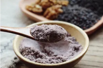 黑谷粉是由黑芝麻、黑豆、黑米研磨制成,其中黑芝麻味甘,性平,入肝、肾经;黑豆味甘,性微寒,归脾、肾经;黑米味甘、性平,归脾、胃经。黑谷粉具有补肾养血、健脾开胃的功效。