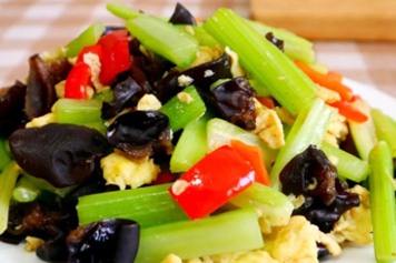 黑木耳和芹菜中含有多种营养物质,如蛋白质、维生素、膳食纤维等,二者可一起凉拌、炒或煮着吃。黑木耳和芹菜一起吃,具有补充营养、润肠通便的功效。