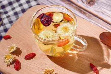 金银花味甘、性寒,归肺、心、胃经;菊花味辛、甘、苦,性微寒,归肺、肝经;红枣味甘、性温,归脾、胃、心经;枸杞味甘、性平,归肝、肾经,因此金银花菊花红枣枸杞茶具有疏风散热、养肝明目、养血安神等功效。