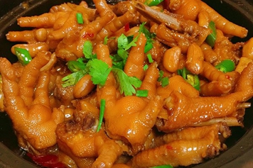 将鸡脚、花生洗净,然后将鸡脚焯水后与花生一同放入砂锅中加水煲制,出锅前放入调味料即可食用。