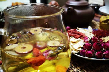 玫瑰味甘、微苦,性温,归肝、脾经;黄芪味甘,性微温,归脾、肺经;红枣味甘,性温,归脾、胃、心经;枸杞味甘,性平,归肝、肾经。玫瑰黄芪红枣枸杞茶具有益气养血、滋阴助阳的功效。