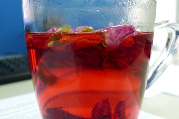 取适量玫瑰花、桑椹、枸杞放入杯中,倒入沸水冲泡,静置一段时间,茶水稍凉后即可饮用。