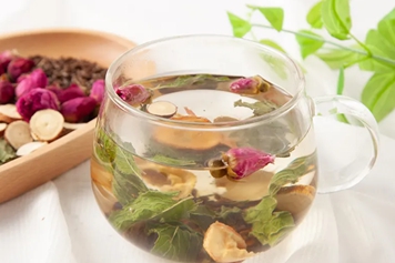玫瑰花味甘、微苦,性温,归肝、脾经;甘草味甘,性平,归心、肺、脾、胃经。玫瑰花甘草茶具有行气解郁、补脾益气、活血止痛等功效。