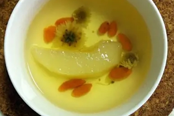 梨甘凉,可滋五脏之阴,清虚劳之热;菊花微寒清热,既能疏散肝经风热,又能清泻肝热以明目;枸杞可补养肝肾而明目。故梨菊花枸杞煮水有清肝明目的功效,适用于肝火上攻所致目失所养、眼目昏花、视物不清等症。