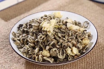 茉莉玉螺是由茉莉花经过加工制成形似玉螺的花茶,具有减轻口臭、行气解郁等功效。
