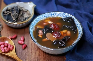 木耳味甘,性平;红枣味甘,性温;生姜味辛,性微温。木耳加红枣加生姜具有化痰止咳、补气养血的功效。