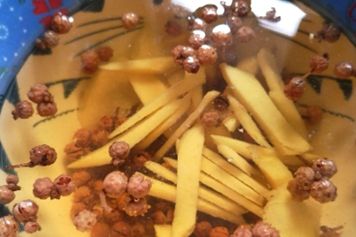 生姜味辛,性微温,归肺、脾、胃经;花椒味辛,性温,归脾、胃、肾经。生姜花椒水具有温中止痛、解表散寒等功效。