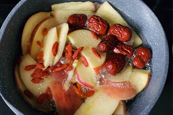苹果归脾、肺经,性平,味甘、酸;枣子归脾、胃、心经,性温,味甘;枸杞归肝、肾经,性平,味甘。苹果枣子枸杞煮了吃具有补充营养、补中益气、滋补肝肾等功效。
