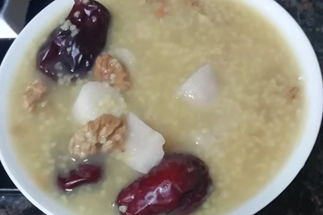 将苹果、山药洗净切块,核桃、小米洗净,放入锅中加水煮制,煮熟放温食用。